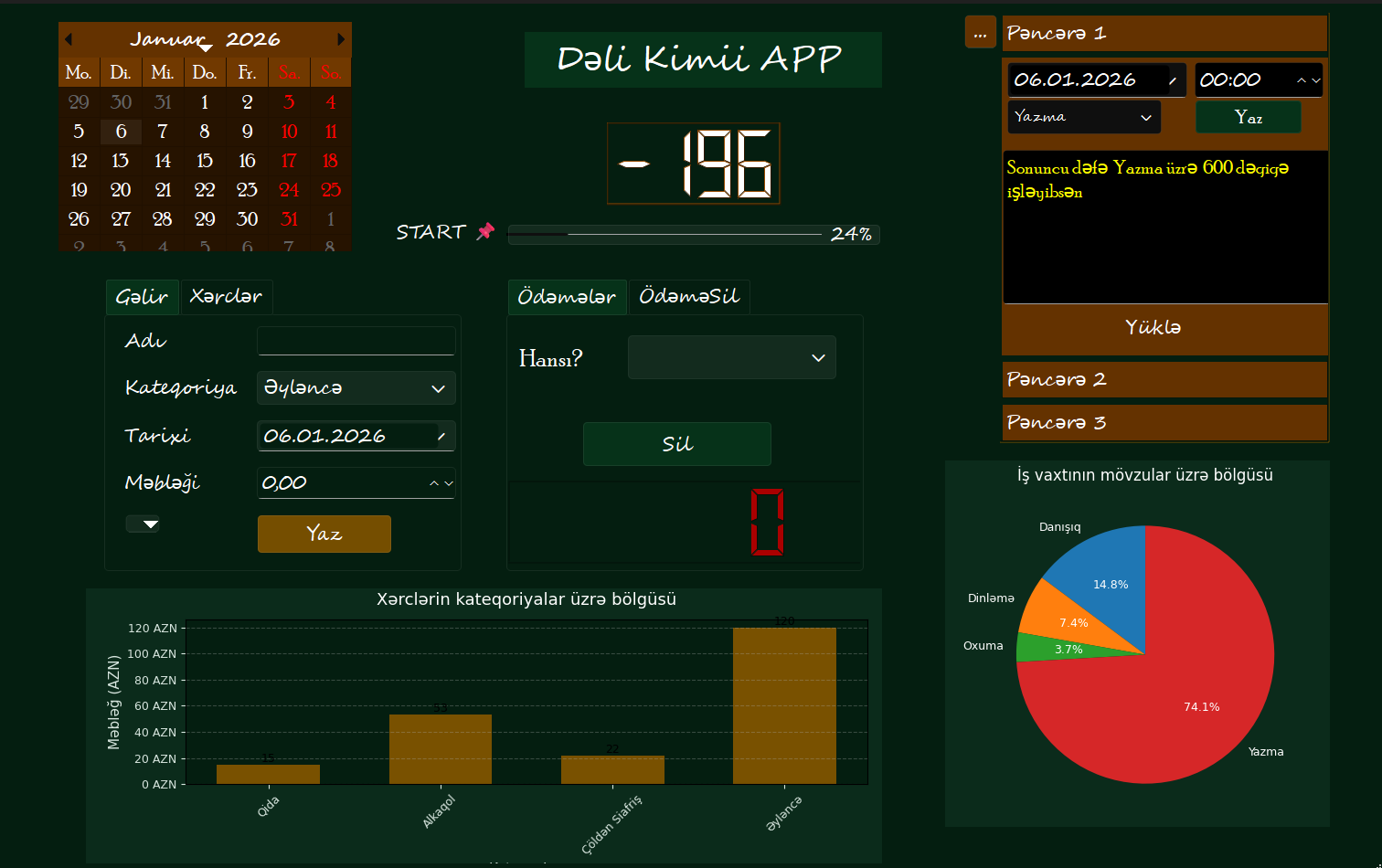 Dəli Kimii APP helps you manage your personal finances by allowing you to record income and expenses by categories, calculate your balance in real time, and keep track of payment history with reminders. It also automatically manages categories for easier organization. The app provides visual analysis with graphs and charts using Matplotlib, lets you track your progress over a chosen time period, and supports saving and loading data from CSV files as well as exporting reports to Word. The interface is fully in Azerbaijani, built with PySide6 (Qt6), features a dark theme with green tones, and includes three windows for activity control.